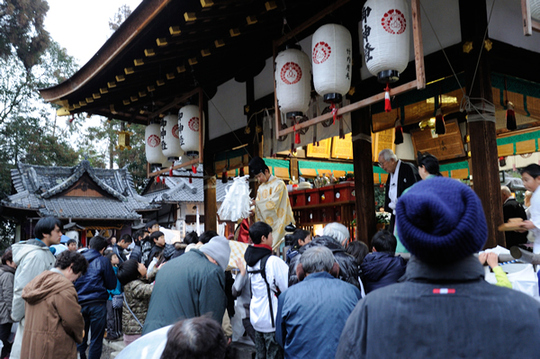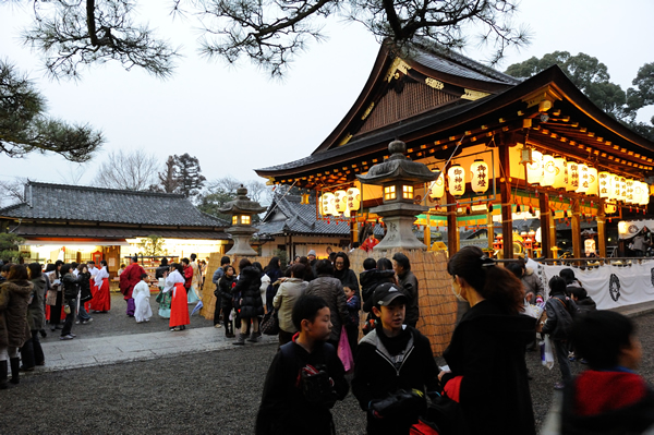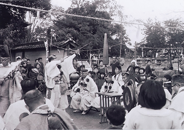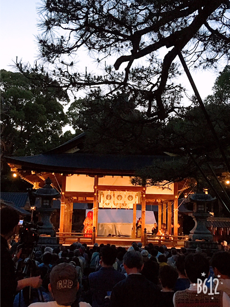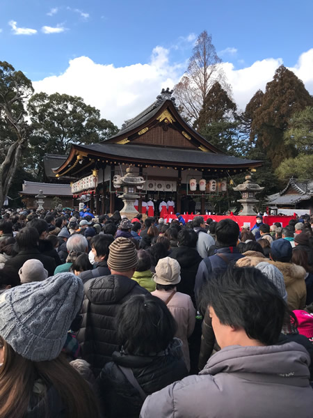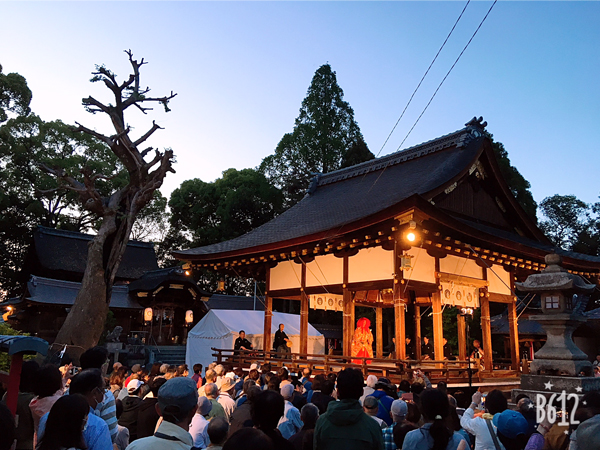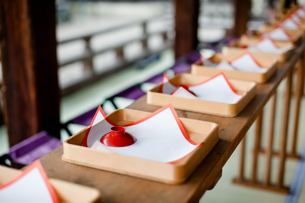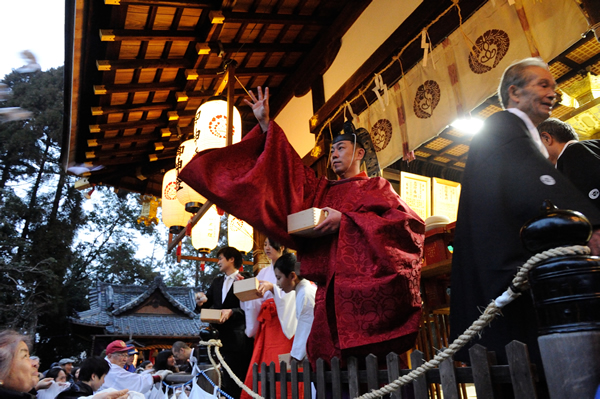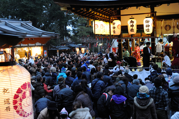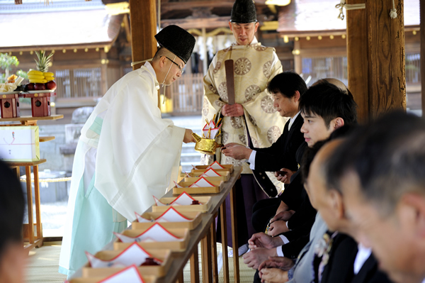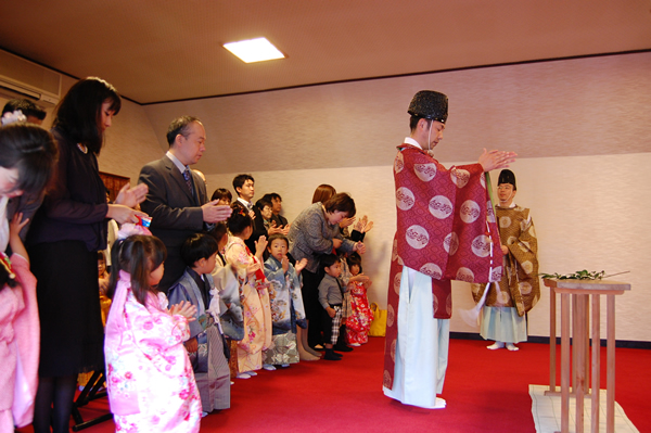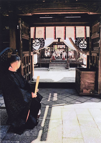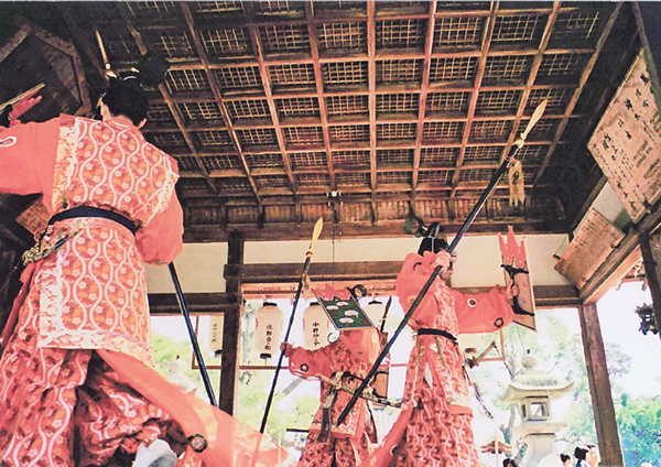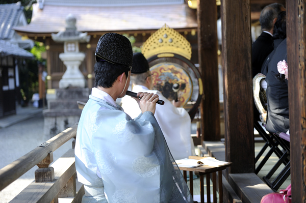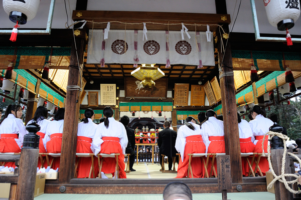 笛や太鼓の雅楽の音色、巫女による神楽の舞で神聖な空気が流れる拝殿。