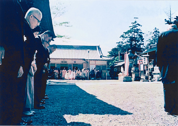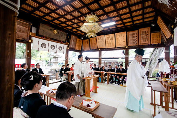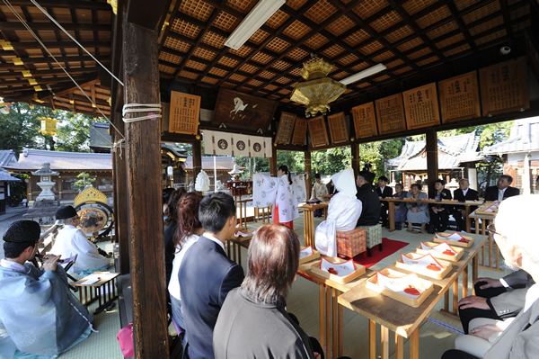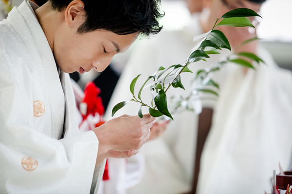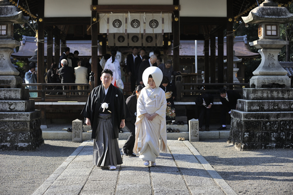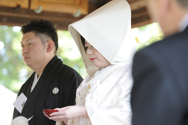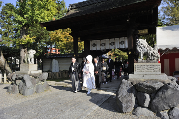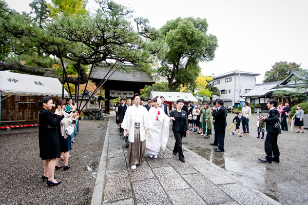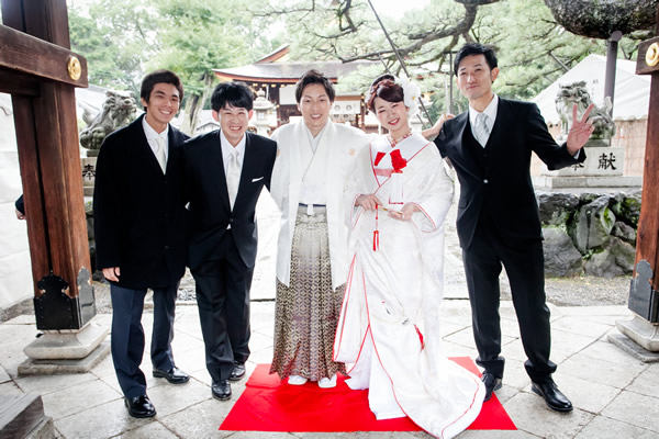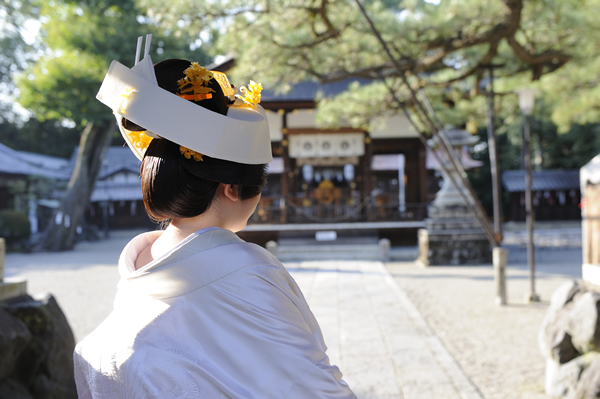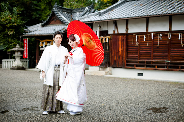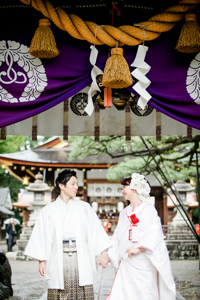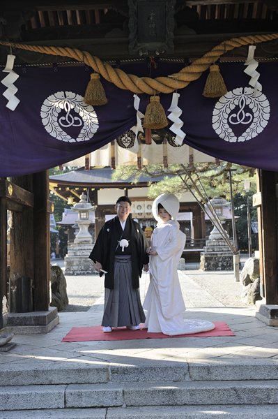 由緒正しい立木神社の境内に似合う紋付き袴、白無垢姿の新郎新婦。